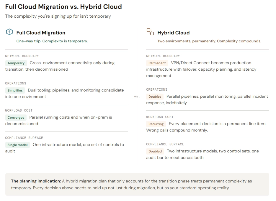 A full cloud migration is a one-way trip. You move everything, decommission on-prem, and operate in a single environment. Hybrid is fundamentally different because the complexity isn't temporary. You're committing to an architecture where two environments coexist permanently, and every decision you make has to hold up under that reality.